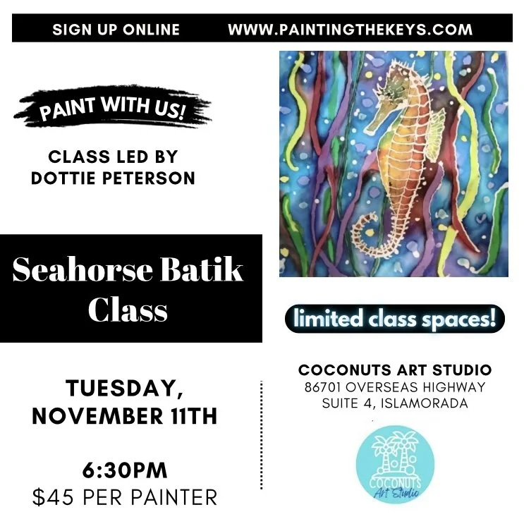 Classes below are open to the public. Everything is included and will be set up for you when you arrive. Rooftop Sandbar - Keys Rooster on Canvas - October 23 $45.00 Coconuts Art Studio - Monday Open Paint - October 27 from $20.00 DoubleTree - Cotton Candy Skies on Canvas - October 28 $50.00 Coconuts Art Studio - Monday Open Paint - November 3 from $20.00 Coconuts Art Studio - Monday Open Paint - November 10 from $20.00 Coconuts Arts Studio - Seahorse Batik - November 11 $45.00 Coconuts Art Studio - Monday Open Paint - November 17 from $20.00